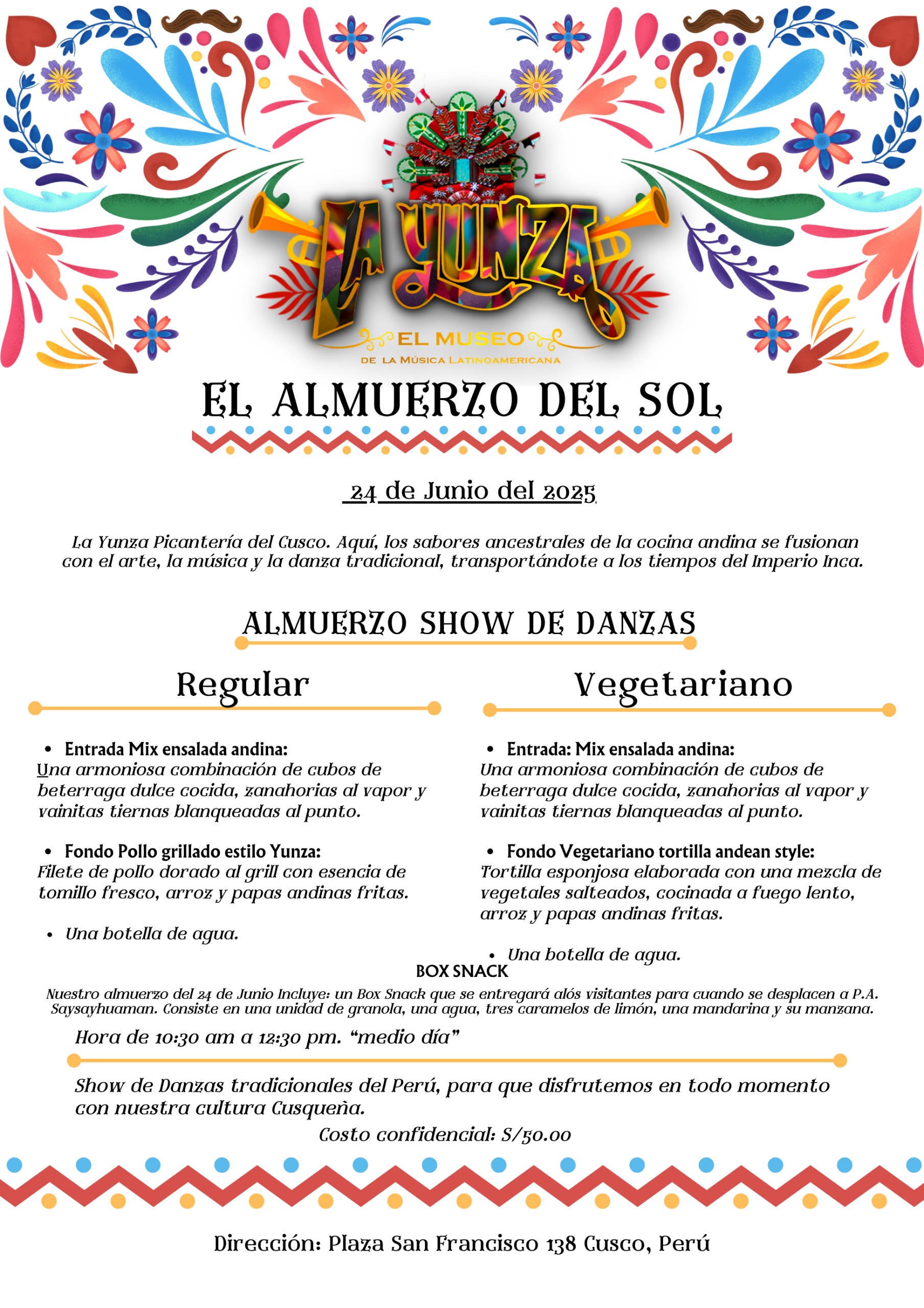 La Yunza Picantería del Cusco. Here, the ancestral flavors of Andean cuisine blend with art,music, and traditional dance, transporting you back to the time of the Inca Empire