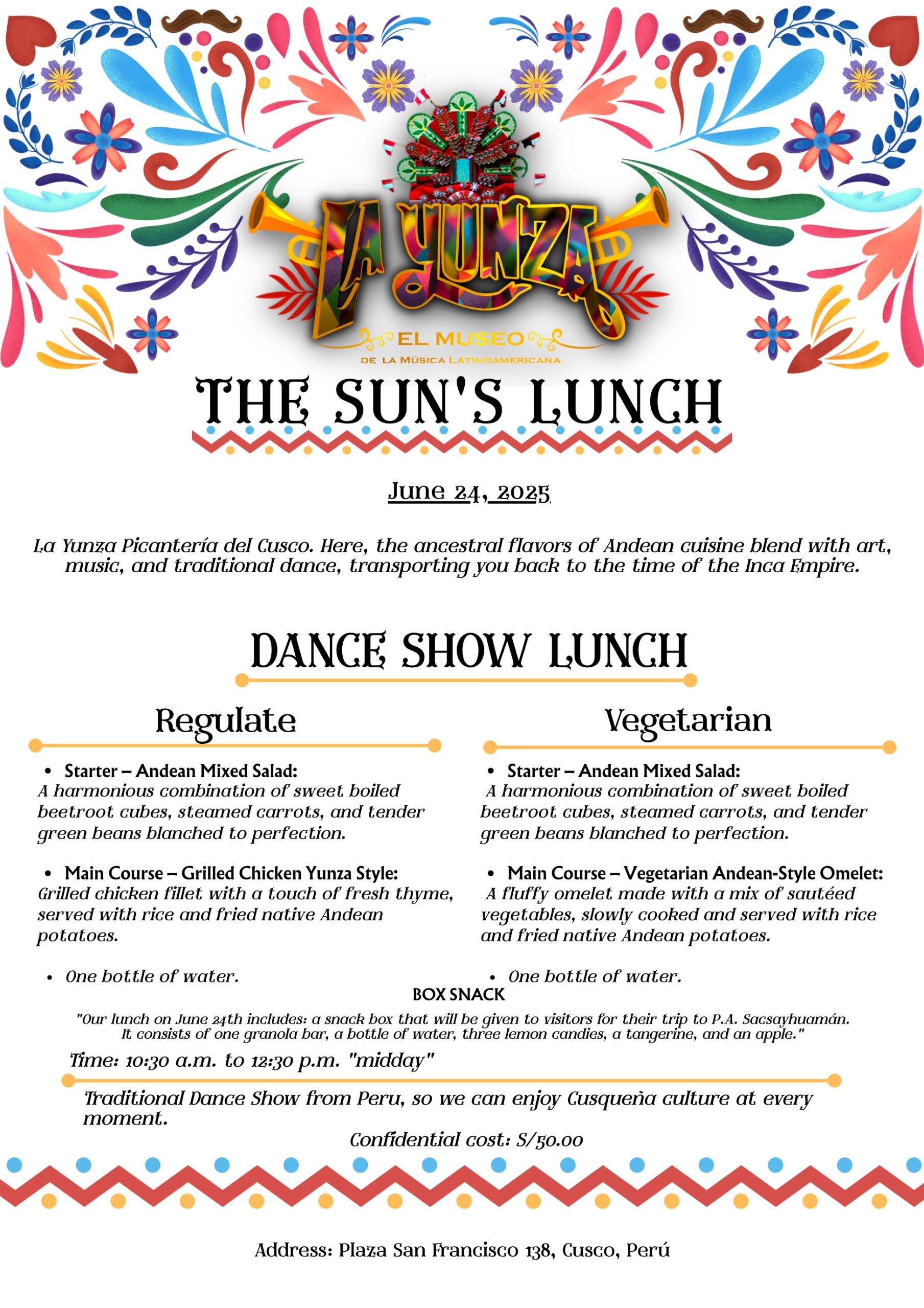 Our lunch on June 24th includes: a snack box that will be given to visitors for their trip to P.A. Sacsayhuamán.